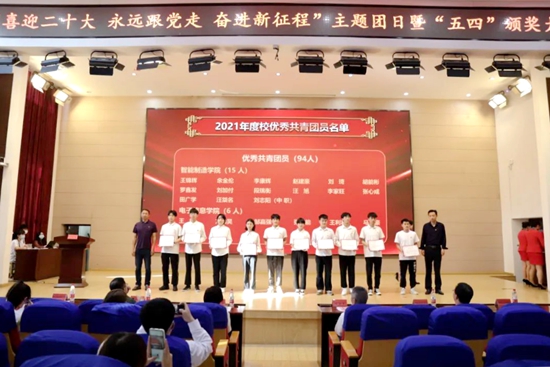 会上,校党委办公室主任、党委组织部部长杨静宣读了《关于表扬2021年度五四红旗团组织、优秀共青团干部、优秀共青团员、社团活动积极分子的通报》。工业互联网学院团总支荣获“五四红旗团总支”称号;2021级机械自动化班团支部等17个团支部荣获“五四红旗团支部”称号;凌梦老师和罗红昊等64名学生荣获“优秀共青团干部”称号;王锦辉等94名学生荣获“优秀共青团员”称号;占锋等30名学生荣获“社团积极分子”称号。随后,还开展了新团员入团礼活动;活力团支部代表通过手语舞、朗诵、啦啦操等形式展示了新时代青年的青春风采;四位青年师生作为代表在会上进行了发言。